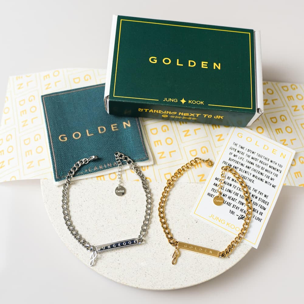 This bracelet, inspired by Jungkook’s unique style and his iconic Golden Moment, is a must-have for any Kookie Stan.The reversible bar design is elegantly engraved with “Golden” on one side and “Jungkook” on the other, offering two stunning looks in one piece.A subtle yet powerful symbol of love and admiration, perfect for any occasion. Don’t miss out—own this golden expression today!